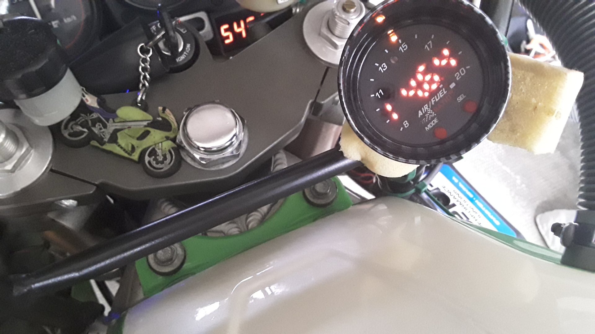 Wenn alles auf Temperatur ist, zeigt es gleichmäßig an. Es zeigt unter Last immer zu fett an, Afr von höchstens 12 bis ca 10,5/1. Standgas ziemlich gleichmäßig 11,5/1.