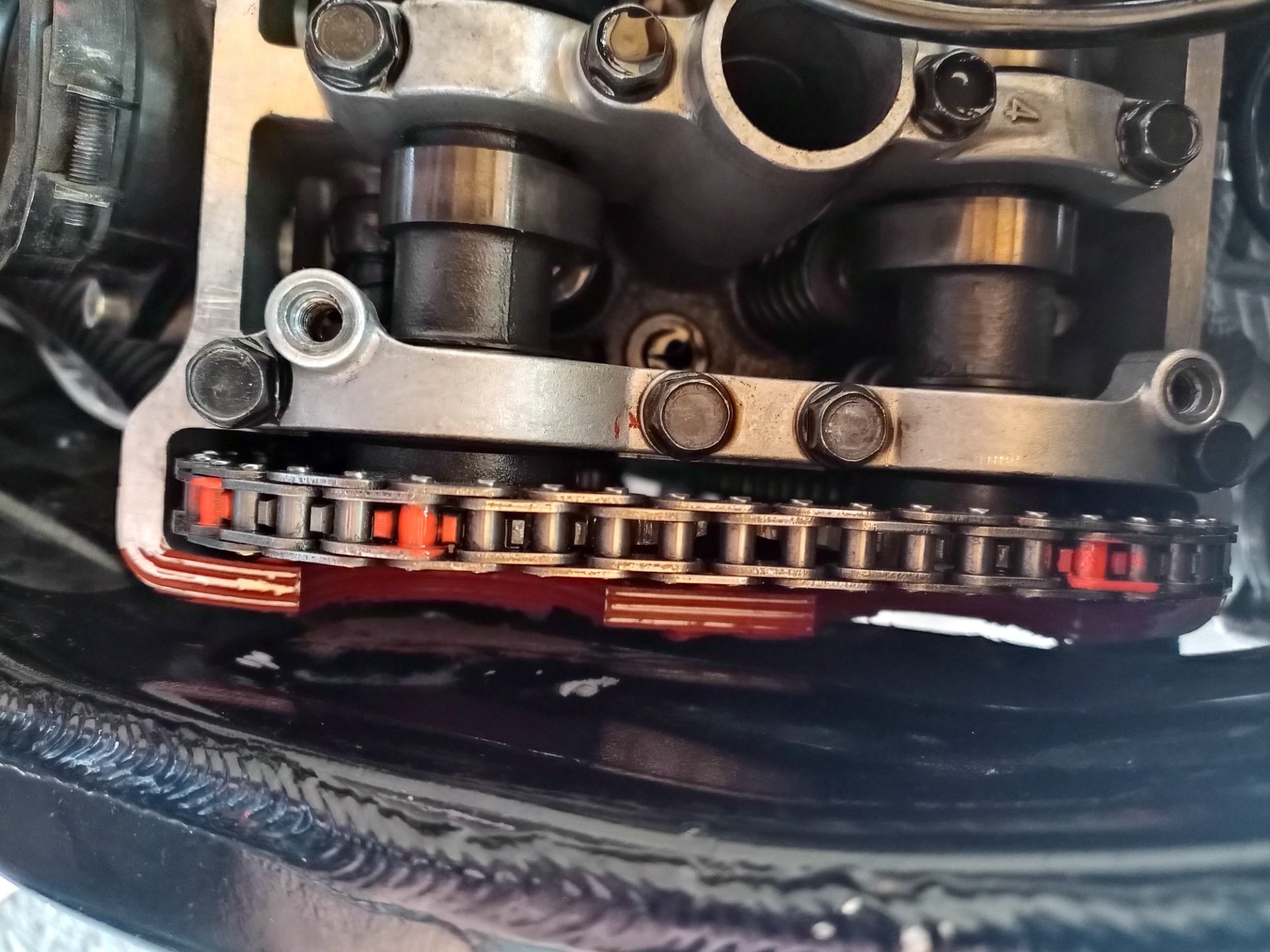 Anschließend sind, wie beim Einstellen des Ventilspiels, die Nockenwellen, Kipphebel, Steuerkette usw. sichtbar: