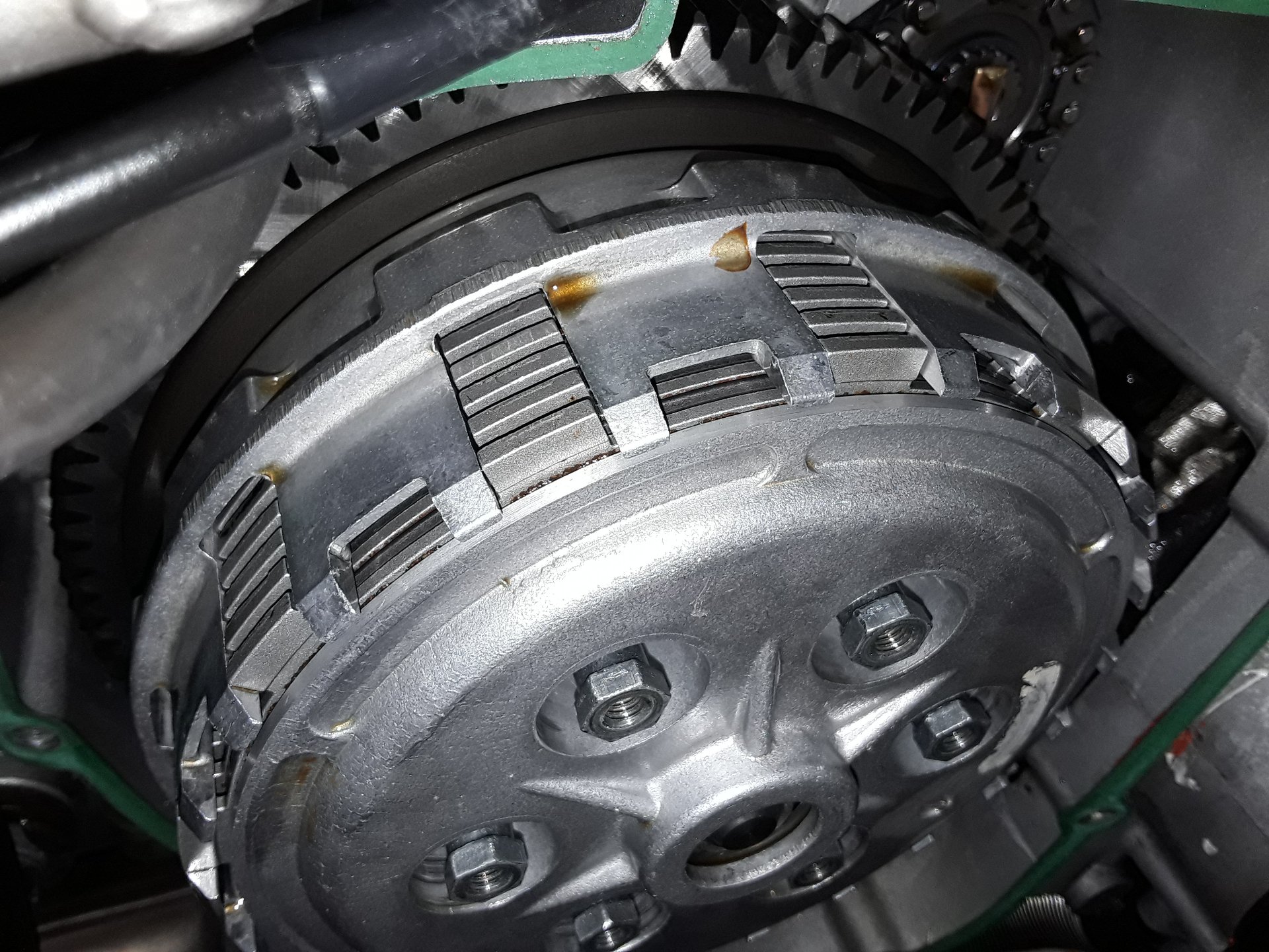 Damit war keine Funktion spürbar. Bei Tests mit Runterschalten und schnellem Einkuppeln ohne Zwischengas konnte das Hinterrad zum Rutschen gebracht werden. Die Rampen an der Kupplungsnabe und die Druckplatte hatten auch keine Spuren, die regelmäßige Funktion andeuten.