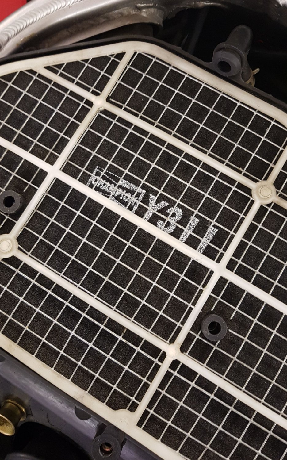 2) Der Schaumstoff auf der Rückseite des Filters, der noch hinter einer Art Lochblech sitzt, war schon nahe dran, sich anfangen aufzulösen.