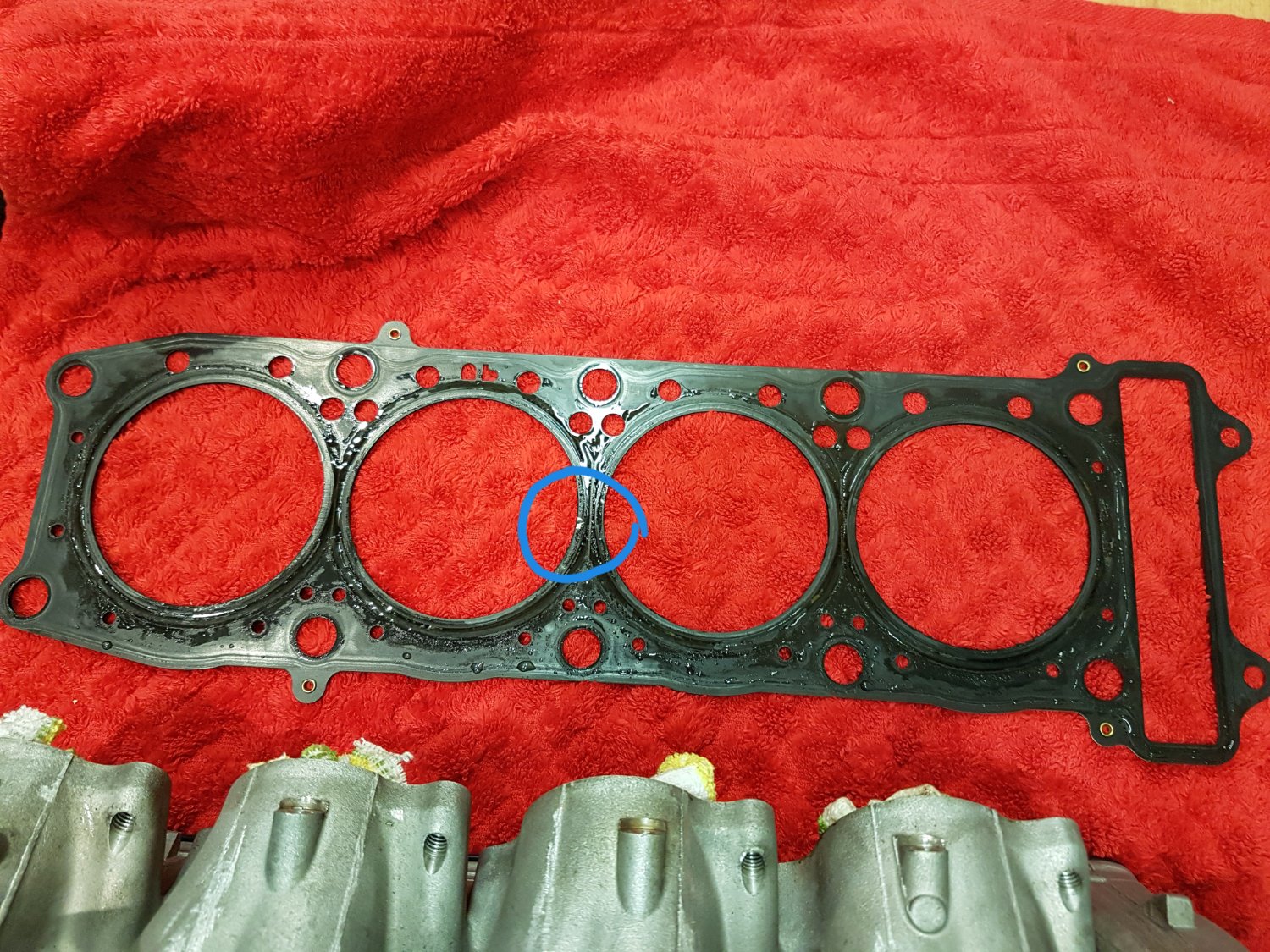 Eventuell bestand die Undichtigkeit schon seit Einbau des 9ér Motors. Das würde zumindest die dunkle Färbung im Krümmer dieses Zylinders erklären.