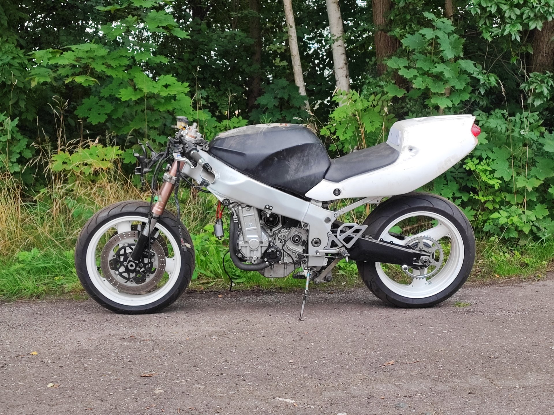 Ziel ist bei dem Bike eine Art Rennreplika für die Straße zu erschaffen, alles legal mit TÜV usw... Also hab ich erstmal ein Rennheck gekauft und angebaut welches natürlich mit dem Original Heckrahmen nicht passt.. man sieht deutlich den Überstand vom Heckrahmen