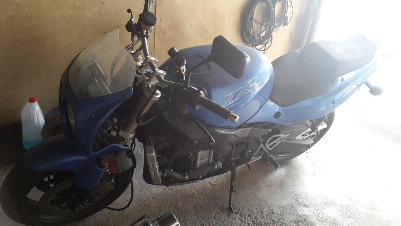 vor zwei Tagen haben Benny und ich uns spontan ein gemeinsames Wiederaufbauprojekt geangelt. Bei einem Händler im Nachbarort fanden wir eine blaue Jott in relativ verwahrlostem Zustand und konnten das arme Geschöpf dann nicht einfach seinem Schicksal überlassen... Gestern ist die Jott, getauft auf den Namen Erika, dann schon bei unseren beiden anderen ZXRen eingezogen. Das ganze gleicht eher einem Scheunenfund, da sie im Freien in einem überdachten Verschlag gestanden ist. Sie hat nun 72 000 km auf der Uhr und ist seit 8 Jahren stillgelegt. Kleine Vorwarnung - der wahre Zustand ist wesentlich übler als er auf den folgenden Bildern erscheint