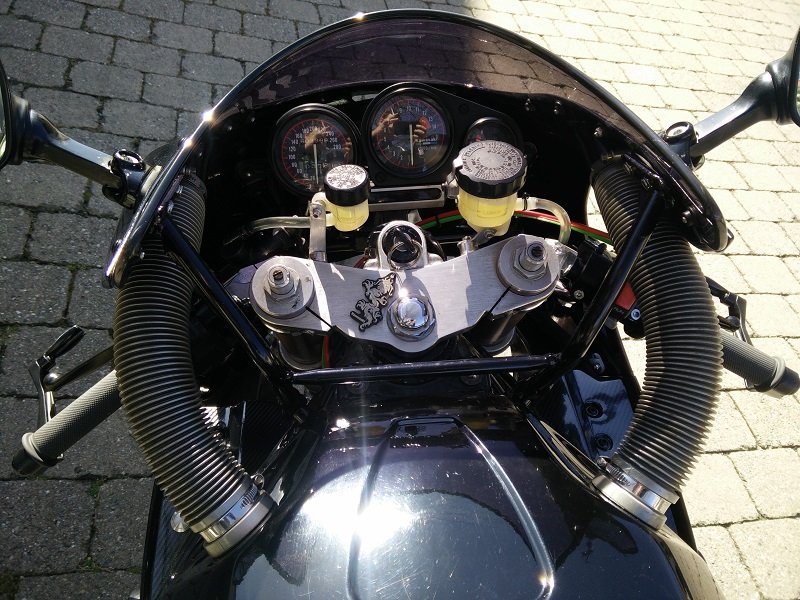 Stummellenker sind nun von Gilles, original Bremspumpe ist einer Magura HC1 gewichen, der Gasgriff einem Kurzhubgasgriff von Domino (Danke an Matschak hierbei) und die rechte Schaltereinheit von einer Honda VF-irgendwas.