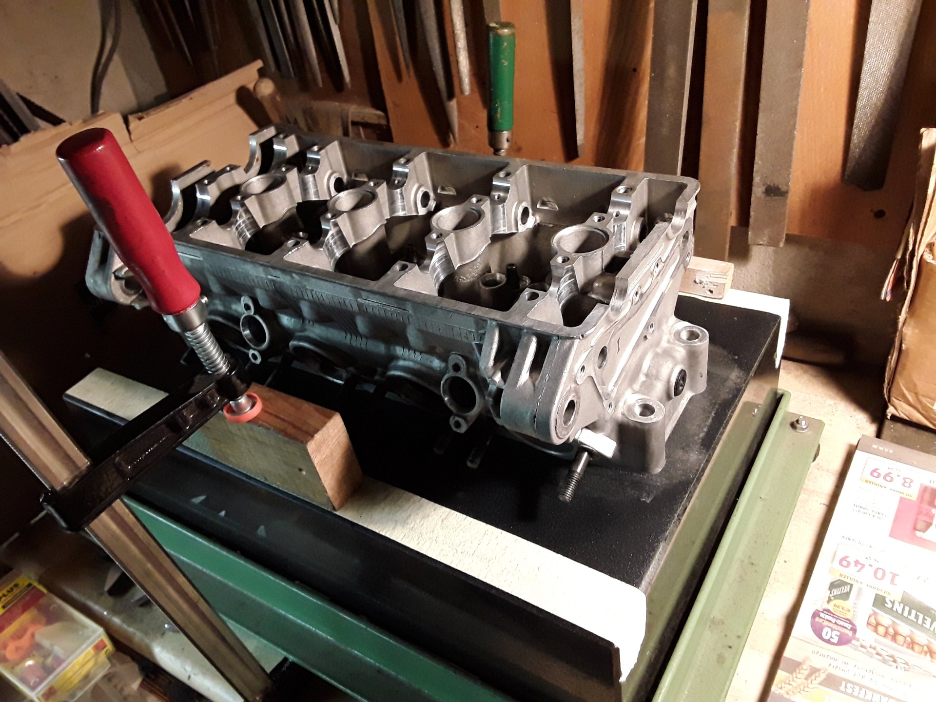 Hatte beim Motor schon einen Druckluft Leaktest gemacht und wusste dass ein paar Auslässe pfeifen, aber mit dem Licht sieht mans dann genau. Wenn der Spalt dunkel bleibt, ist es schon ziemlich gut. Ein Dichtheitstest mit Spiritus nachher hat es bestätigt. Ein paar Ventile hab ich bis zum prellen gebracht, aber bei allen gings einfach nicht. Die Sitzfläche war bei allen gleichmäßig, aber die Ventile selber und die Führungen sind nicht mehr perfekt, jedoch noch gut in der Toleranz.