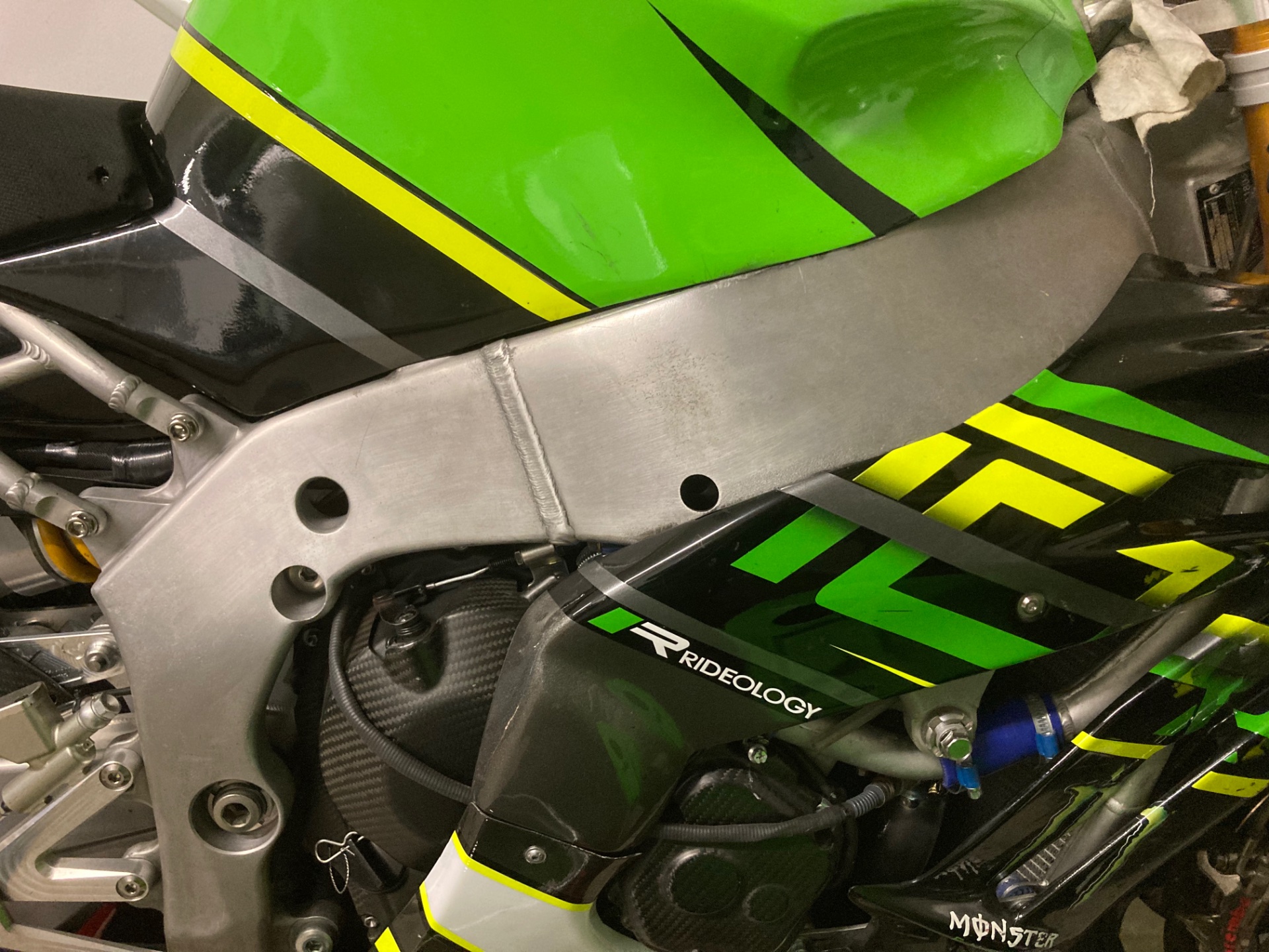 Bei der ZXR sind die Seitenteile vom Rahmen aus Alublechen gebogen und verschweisst. Nur der hintere Teil, wo dieRasten angeschraubt sind, und der Lenkkopf bestehn aus Aluguss.