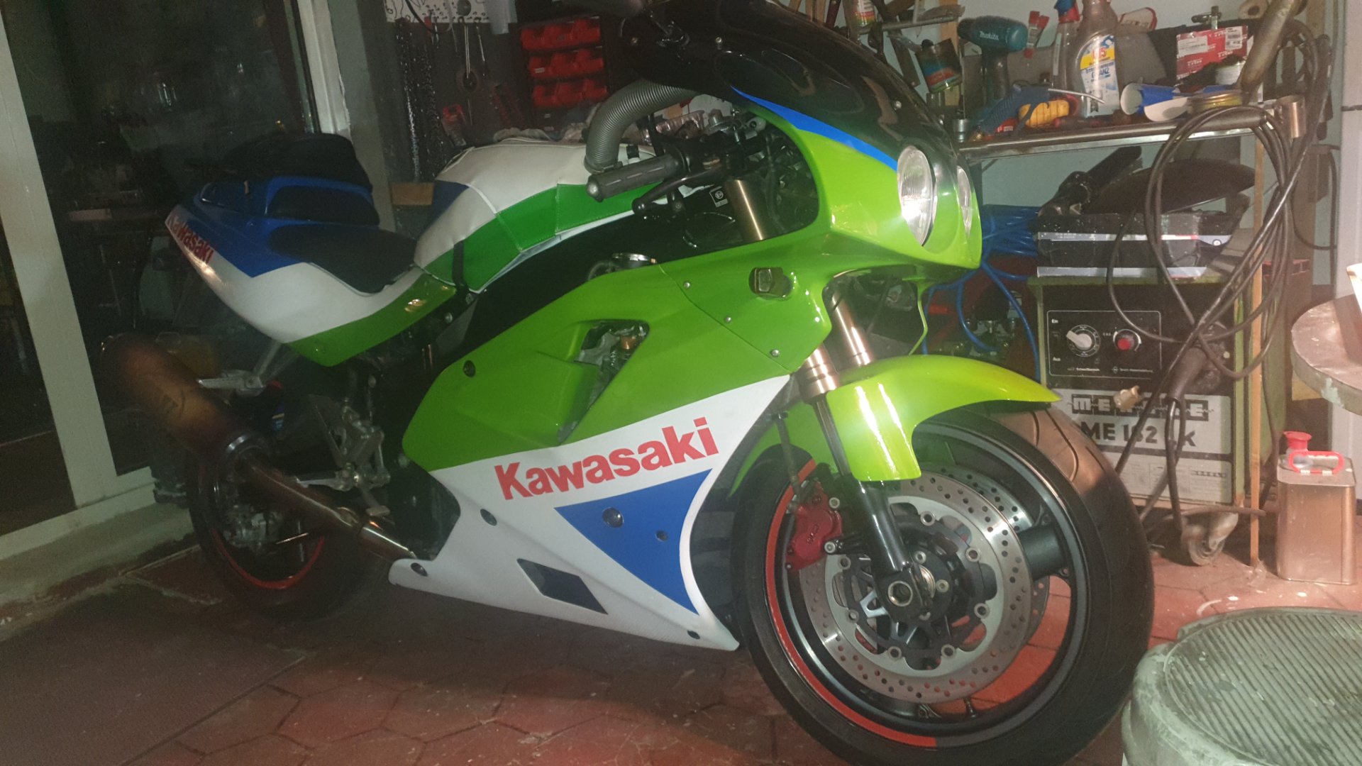 gemacht wurde Vergaser ultraschallgereinigt, dabei wurde festgestellt das die Innensiebe zu mit Rost waren :shock: . in den Tank geschaut, ja innen rostig, also Tank entrostet und neu versiegelt Benzinschläuche und Benzinhahn neu, Benzinfilter neu und Zündkerzen neu. Jetzt muss ich nur noch auf schönes Wetter warten, da wohl die Nachbarn was dagegen haben, wenn ich Sie im Wohnzimmer laufen lasse :lol: . Der Kawasaki Schriftzug ist Handgeschnitten mit der Fingernagelschere :lol: