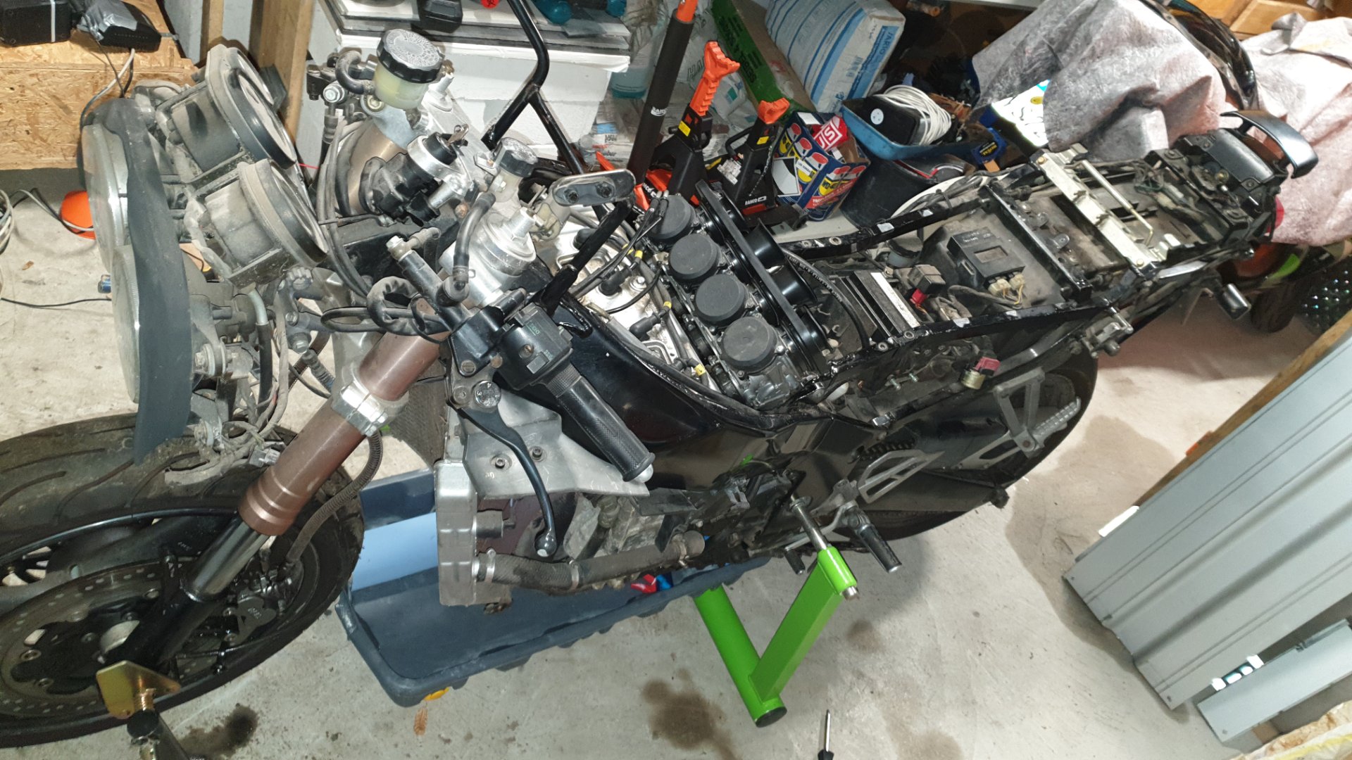 Als ich letztens beim aufräumen meiner Lagergarage ( es hatte reingeregnet) meinen alten Motor (einen Zx750 J Motor mit 12 000 Km wiedergefunden hatte ( hatte meiner J damals mit einem Schrauberkumpel einen 900B Motor verpasst). Kamen mir direkt wieder viele Erinnerungen an mein Mädchen wieder hoch (leider nicht nur gute, da ich einen Abflug in der Kurve auf nassem Laub hatte), danach war dann erst mal 10 Jahre Pause weil ich auch einfach nicht mehr wollte.