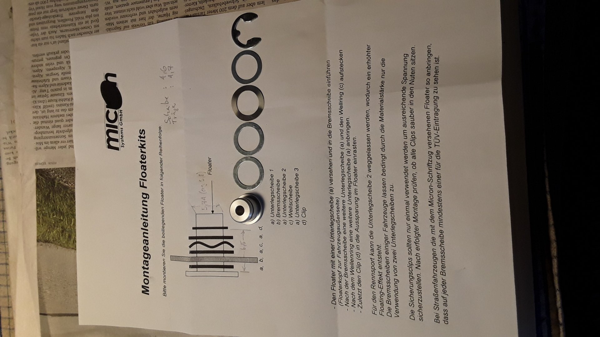 Habe wie in der Anleitung vermerkt nur 2 Scheiben verwendet. Mit 3 war der Zusammenbau zu stramm und es war fast wie vorher. Das liegt hauptsächlich daran, dass der Träger bei mir 1/10mm dicker ist als der Bremsring. Mit 2 Scheiben ist der Schwimmeffekt deutlich, aber noch nicht am klappern. Fahrversuche folgen.