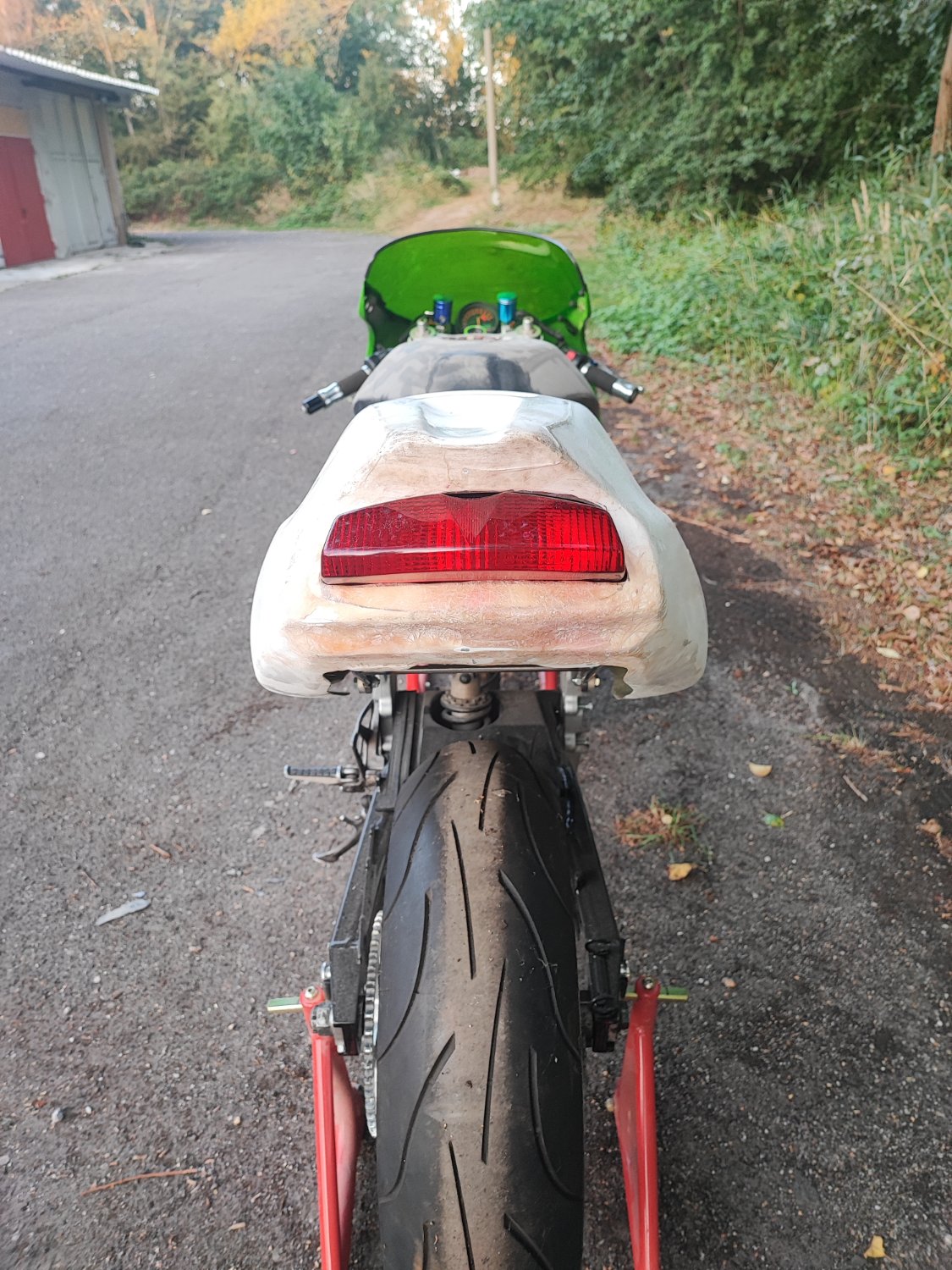 Ziel ist bei dem Bike eine Art Rennreplika für die Straße zu erschaffen, alles legal mit TÜV usw... Also hab ich erstmal ein Rennheck gekauft und angebaut welches natürlich mit dem Original Heckrahmen nicht passt.. man sieht deutlich den Überstand vom Heckrahmen